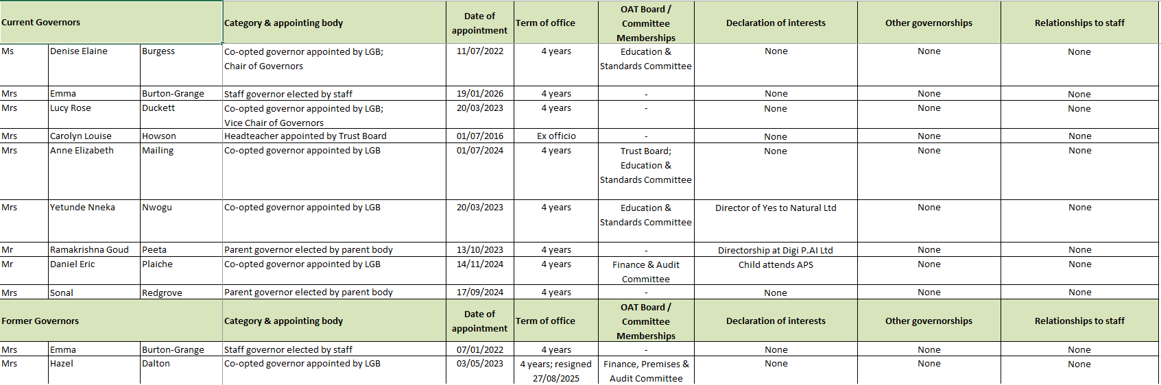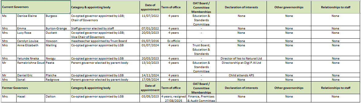 The structure of the governing body for the academic year can be found in the document below, along with their attendance and the resignations of governors in the past 12 months. Information about the structure and remit of the members, trustees and committees can be found on the Orchard Academy Trust website. This can be accessed via the link on the home page. |